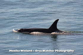 Fast-forwarding ahead for a moment, J28 - as well her dependent calf J54 (just named Dipper) and older daughter J46 - are all still with us. While she still shows a bit of a depression, in my opinion she looks a little more rounded out like perhaps she's been gaining some weight. The fact that she's made it this long after looking in poor health attests to her fighting spirit! We're all still sending her and her little family lots of strong healing energy and love.